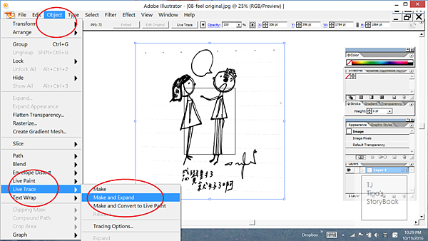 選取好整張圖片之後點選: 物件 (Object)/ 即時掃描 (Live Trace) / 製作並展開 (Make and expand)